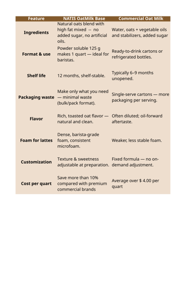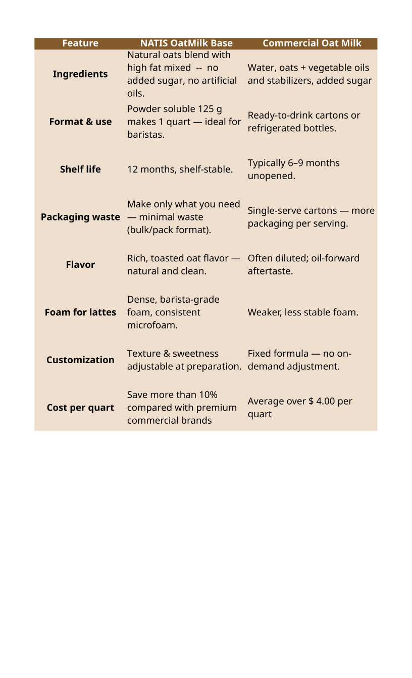 Naturally creamy, designed for coffee. Made from whole-grain oats with no added sugars, carefully processed to achieve a velvety texture, excellent steaming performance, and a neutral flavor that highlights the coffee profile.
